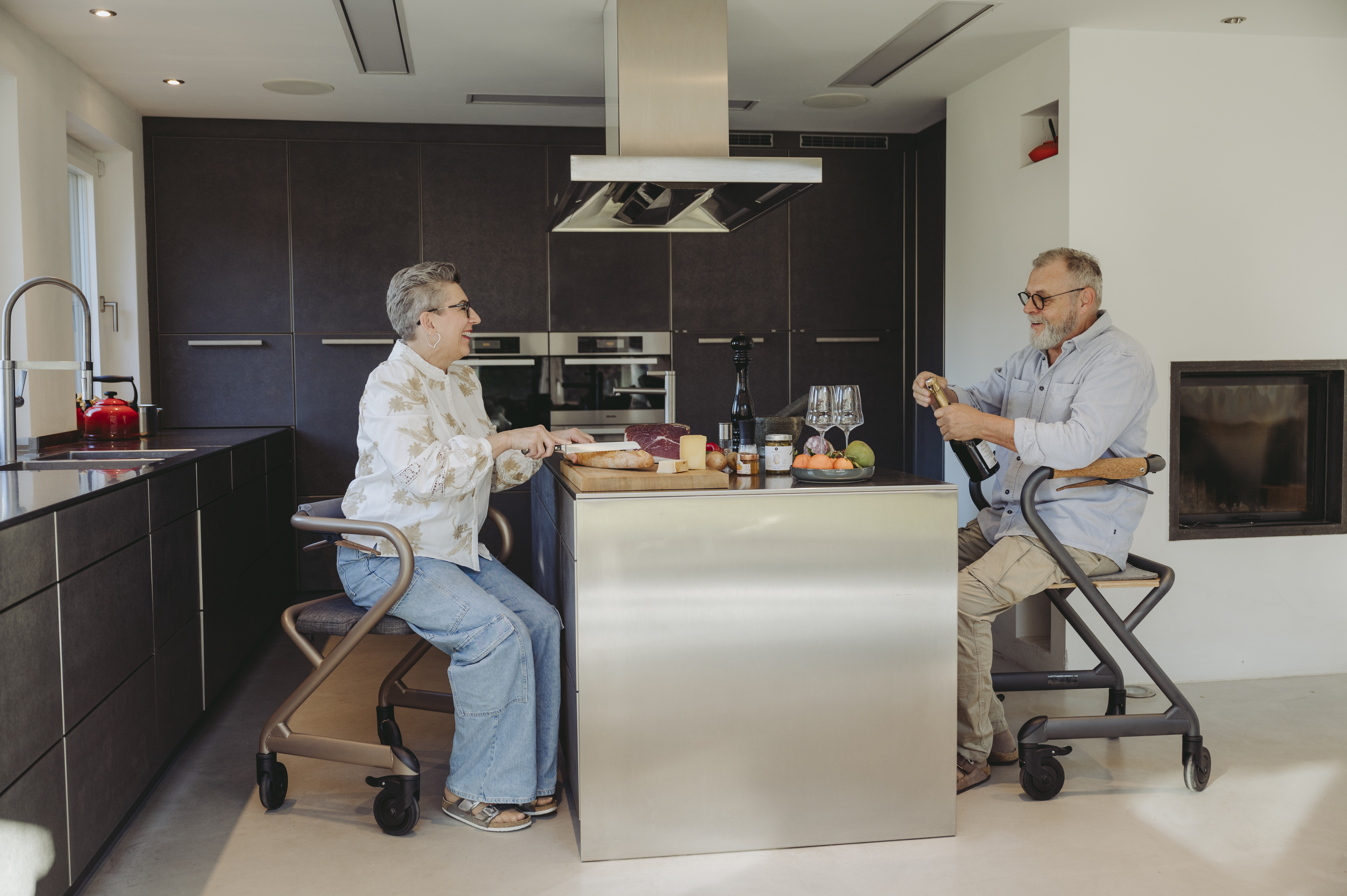 Der Wohnraumrollator ist erhältlich in den Farben Velvet Grey und Champagne Gold.
